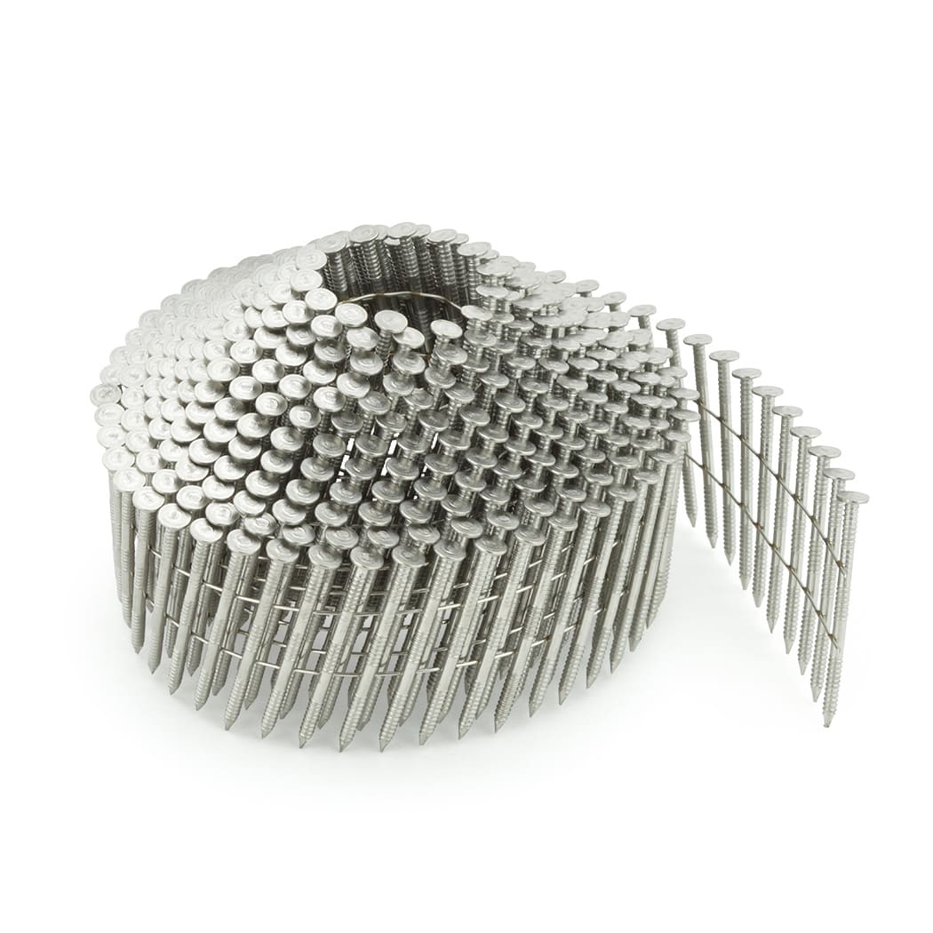 2.1 Gauge stainless steel ring shank 16° wire collated conical (dome) coil nails 27-50mm. Sold per 1 x coil of 350 nails. Manufactured from stainless steel grade 304. Fits the following nail guns Tacwise FCN55V, Tacwise DCN50LHH2, Tacwise FCN50LHH2, Bostitch IC50-1-E, Betco CN45, Hitachi NV50A1, Hitachi NV50AH, Makita AN504, Max CN452S, Max CN552, Max CN550S, Spotnails SCN45, Senco SCN45, Trusty TCN-50, EZ-Fasten CN50 & most other conical (dome) coil nailers.