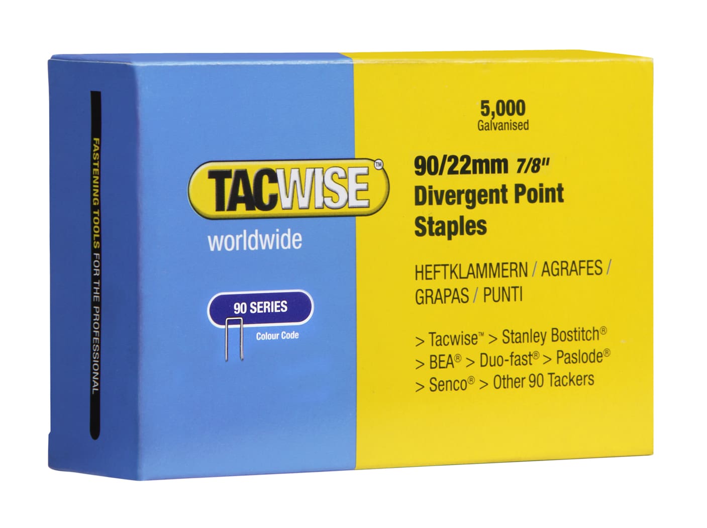 90/22mm Narrow crown galvanised divergent point flooring staples (5,000 per box). These staples are very popular for flooring applications and are ideal for fixing hardboard & plywood. Fits Tacwise 1326, Tacwise C9032V, Tacwise D9040V, Bostitch SX1838-E, Bostitch SB-2IN1-E and most other 90 series narrow crown staplers. Staple width 5.80mm, staple length 22mm & wire diameter 18G.