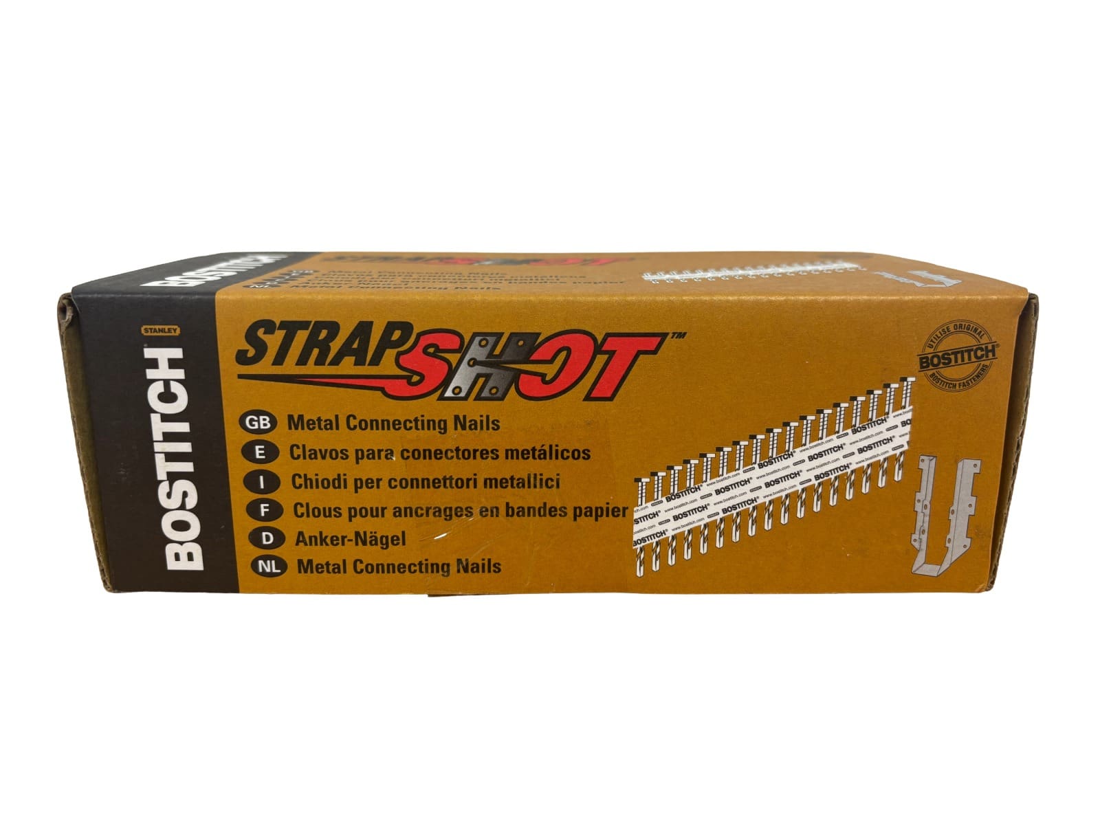 Bostitch PT-MC375SP38G1M “STRAPSHOT” metal connector nails 3.75 x 38mm (1,000 per box). CE marked, spiral shanks, hardened & ideal for structural timber fixings and joist hangers. Fits the Bostitch MCN150-E metal connector nailer.