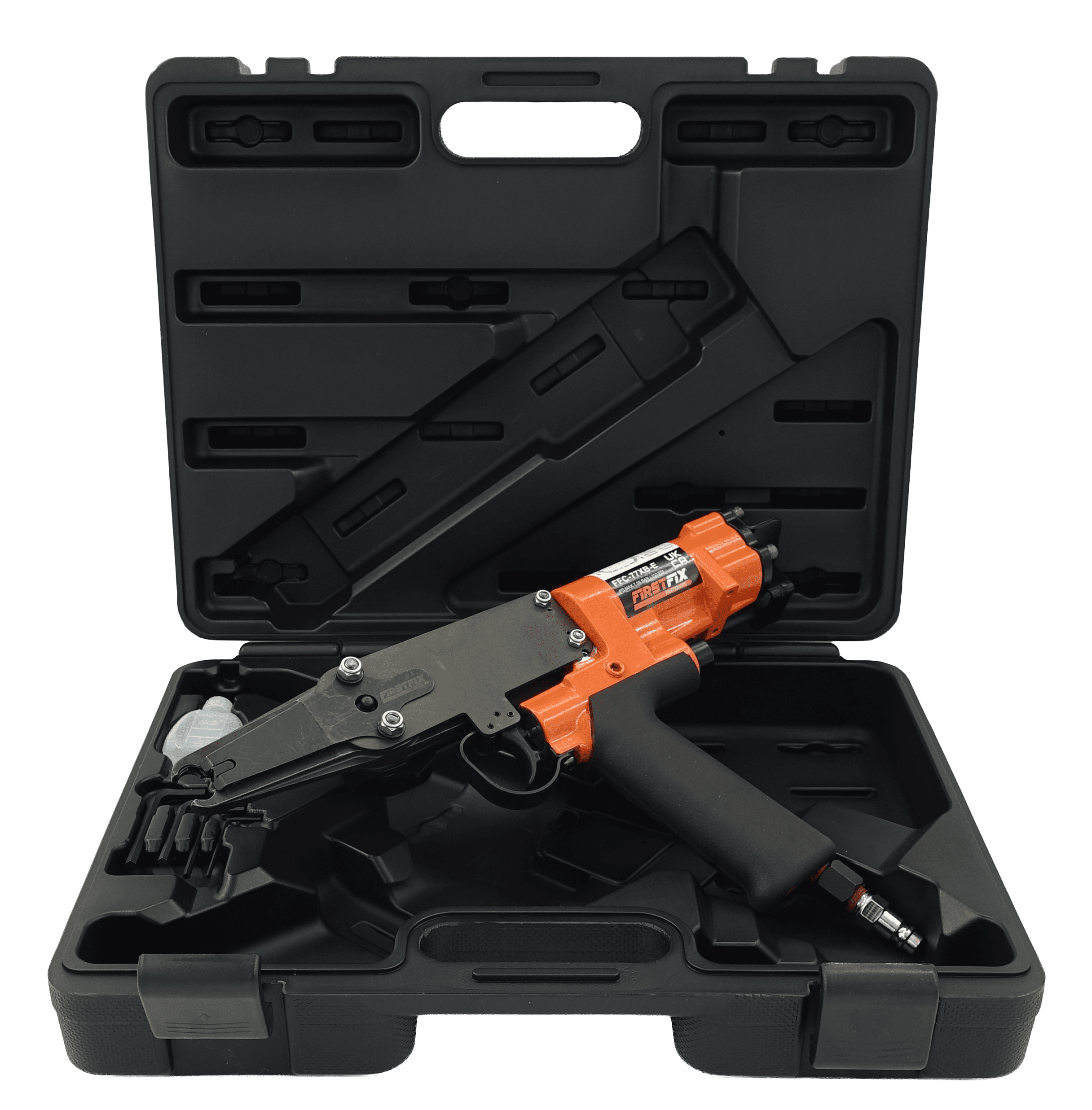 This First Fix FFC-77XB-E pneumatic extra long nose hog ringer uses CL24 series hog rings. Features include a 78mm extra long nose for access into hard to reach areas, rubber comfort grip, trigger operated design and air return system for fast placement of rings. This model has replaced the Bostitch SC77XEB-E in our range.