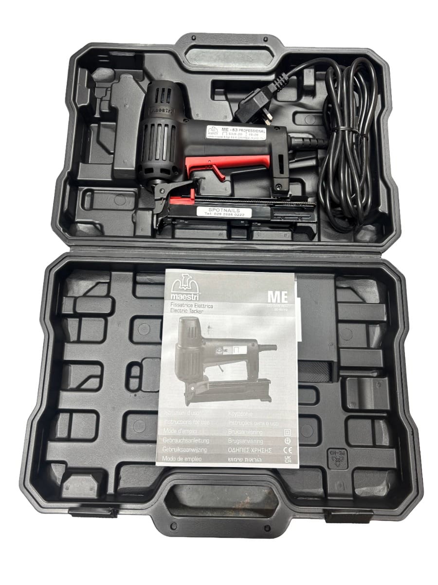 This Maestri ME53 professional electric staple/nail gun is is very popular for DIY upholstery work and fires 53 Series fine wire staples 8-16mm and 18G brad nails 15-20mm. Features include a safety trigger to prevent accidental firing, quick release nose plate, extra long power cord (3M) & a heavy duty carry/storage case.