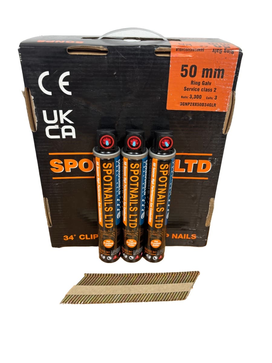 Spotnails 2.8 x 50mm galvanised ring 34° clipped head strip nail & gas pack (3,300 nails & 3 gas fuel cells). Fits Paslode IM350, Paslode IM350+, Fischer FGW 90F, Dewalt DCN692, Max GS690CH, Nailfire NF34-90, Hitachi NR90GC, Bostitch GF33PT, Makita GN9000 & most other cordless 1st fix nail guns.