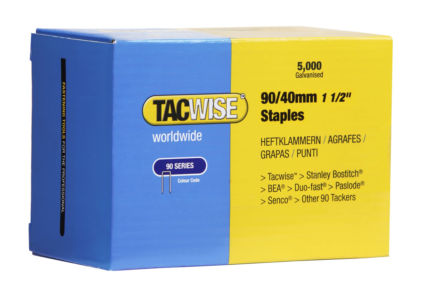 Tacwise 0311 90/40mm narrow crown galvanised staples (5,000 per box). Fits Tacwise 1326, Tacwise D9040V, Bostitch SX1838-E, Bostitch SB-2IN1-E and most other 90 series narrow crown staplers. Staple width 5.80mm, staple length 40mm & wire diameter 18G.