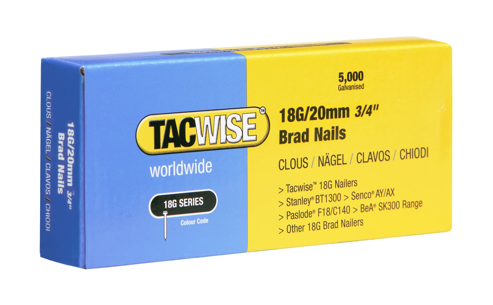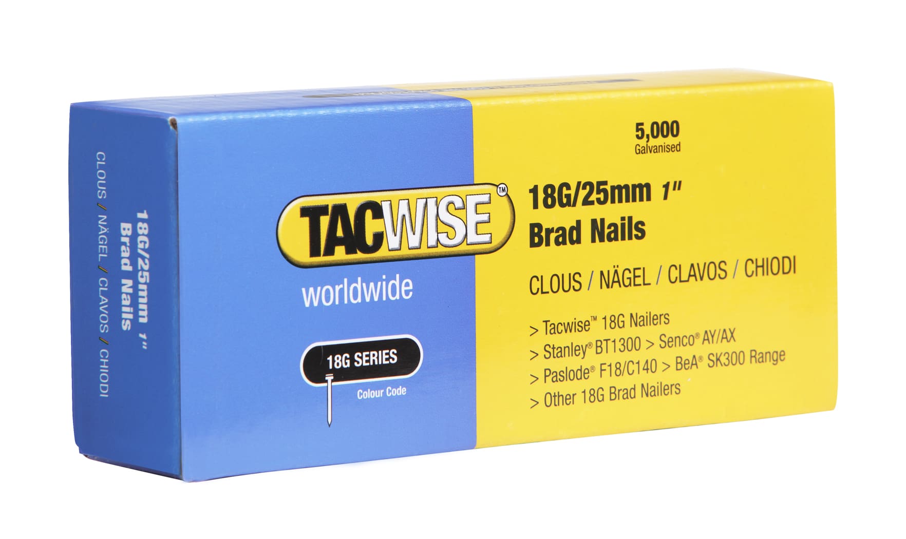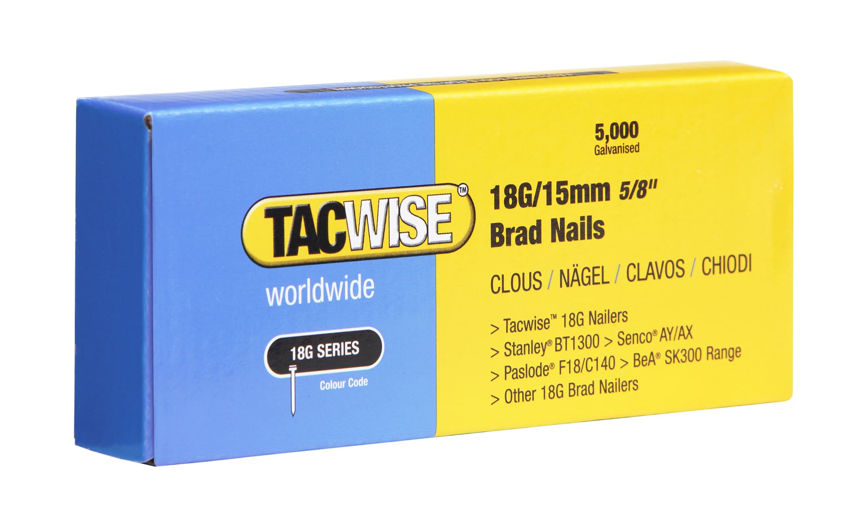 Tacwise 18G 15-25mm brad nails for use in the Maestri ME606 professional electric flooring stapler/nailer. Sizes available are 15mm, 20mm & 25mm and each box contains 5,000 nails.