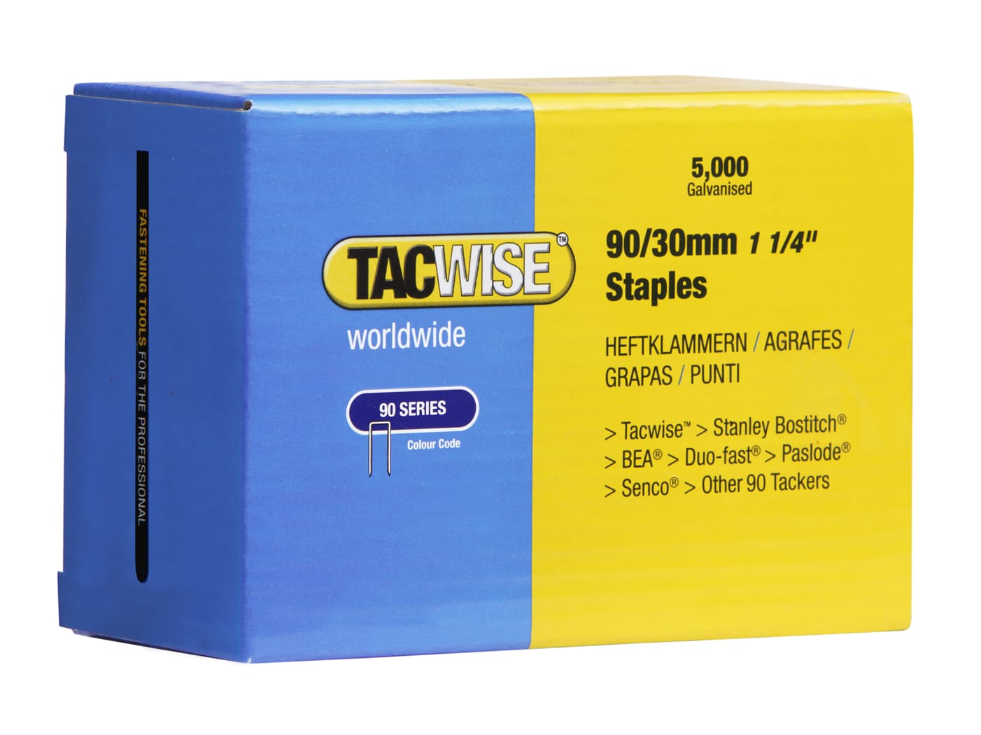Tacwise 0309 90/30mm narrow crown galvanised staples (5,000 per box). Fits Tacwise 1326, Tacwise C9032V, Tacwise D9040V, Bostitch SX1838-E, Bostitch SB-2IN1-E and most other 90 series narrow crown staplers. Staple width 5.80mm, staple length 30mm & wire diameter 18G.