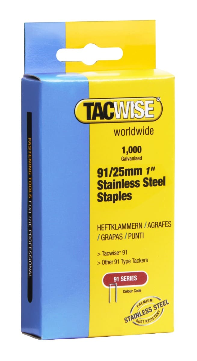 Tacwise 91/25mm stainless steel staples (1,000 per box). Popular for sub-flooring applications. Fits Tacwise 191EL, Tacwise Duo 35, Tacwise Duo 50 & Tacwise 1506.