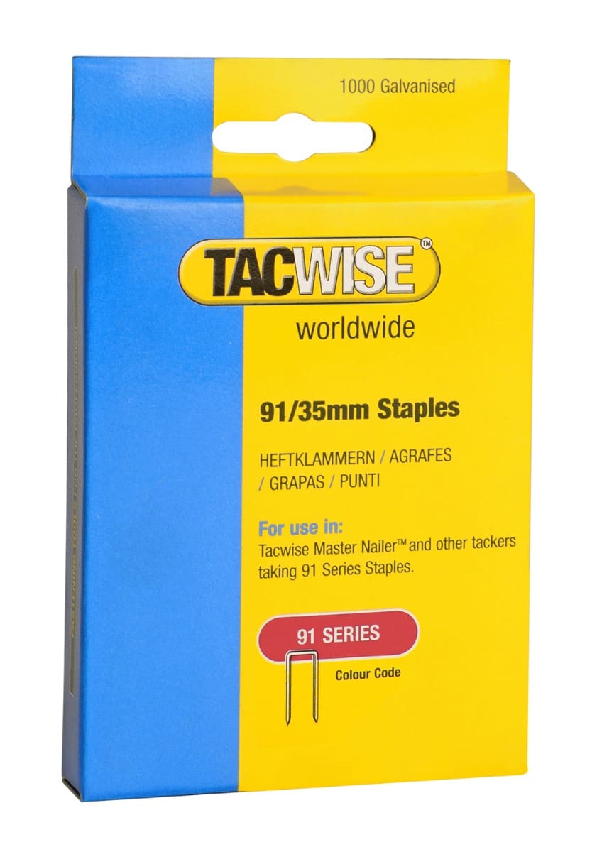 Tacwise 91/35mm galvanised staples (1,000 per box). Fits Tacwise Duo 50 & Tacwise 1506.